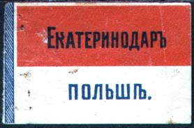 1915(?) г. Разм. 45 х 29 мм. Двухцветная печать на белой бумаге. Виньетка в виде флага Польши с древ-ком. Текст в две строки: «Екатеринодар Польше».
