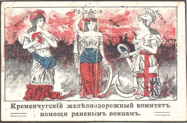 1915(?) г. Разм. рамки 97 х 53 мм. Многоцветная печать на белой бумаге. В рамке аллегория тройственного союза: «Франция - милосердие, Россия - вера, Англия – надежда», на фоне боя. Внизу текст: «Кременчугский Железнодорожный Комитет помощи раненым воинам».