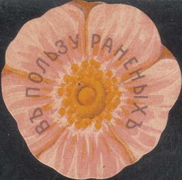 1915(?) г. Виньетка сложной формы в виде цветка разм. 45 х 45 мм. Трехцветная печать на белой бумаге. Изображение цветка и текст по окружности: «В пользу раненых».