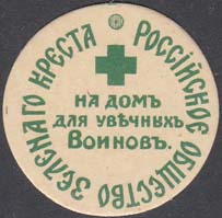 1916 г. 28.-29.04.1916 г. Круг диаметром 33 мм. Одноцветная печать на толстой белой бумаге. В центре текст в три строки: «На дом для увечных воинов». Сверху знак Зеленого Креста. По окружности текст: «Российское общество Зеленого Креста» и декоративный элемент.
