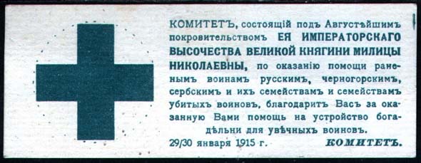 1915 г. 29.-30.01.1915 г. Разм. 98 х 38 мм. Одноцветная печать на толстой белой бумаге. Слева знак Зеленого Креста. Справа текст в десять строк: «Комитет, состоящий под Августейшим покровительством Ее Императорского Высочества Великой Княгини Милицы Николаевны, по оказанию помощи раненым воинам р…