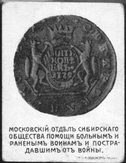 1915 г. 18.09.1915 г. Разм. 43 х 58 мм. Двухцветная печать на толстой Сероватой бумаге с мелованным верхним слоем. В центре реверс 5-ти копеечной сибирской монеты. Внизу текст в четыре строки: «Московский отдел Сибирского Общества помощи больным и раненым воинам и пострадавшим от войны». В правом…
