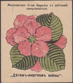 1916 г. 26.-27.09.1916 г. Первый выпуск. Разм. 50 х 56 мм. Трехцветная печать на толстой сероватой бумаге. В центре цветок с листьями. Сверху текст в две строки: «Московское О-во борьбы с детской смертностью». Внизу текст: ««Детям - жертвам войны»». Без точки после нижнего текста.