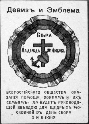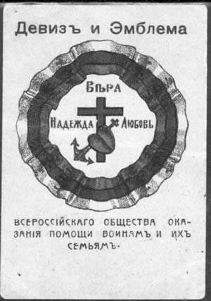 1916 г. 05.-06.06.1916 г. Разм. 52 х 76 мм. Трехцветная печать на толстой желтоватой бумаге. В центре эмблема (Крест, якорь и сердце) и девиз (Вера, Надежда, Любовь) Всероссийского общества оказания помощи воинам и их семьям в обрамлении ленты с цветами Российского флага. Сверху текст: «Девиз и Эм…