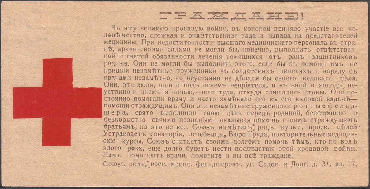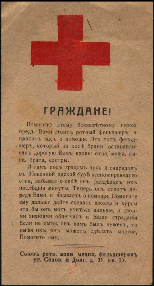 1917 г. Листок разм. 143 х 72 мм. Двухцветная печать на светло-желтой бумаге. Слева красный крест. Справа текст мелким шрифтом в девятнадцать строк: «Граждане! В эту великую войну ... Помогите и вы граждане!». Внизу мелким шрифтом в три строки выходные данные: «Союз ротн. Воен. медиц. Фельдшеров…