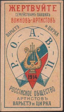 1916 г. 17.-18.09.1916 г. Разм. рамки 31,5 х 58 мм. Многоцветная печать на кремовой бумаге. В рамке на фоне из горизонтальных линий в центре эмблема РОАВЦ. Сверху текст: «Жертвуйте семействам павших воинов-артистов варьете и цирка». Внизу текст в три строки: «Российское Общество Артистов Варьете и…