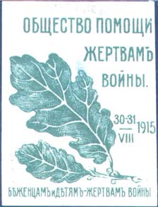 1915 г. 30.-31.08.1915 г. Разм. 37 х 49 мм. Одноцветная печать на плотной сероватой бумаге. В центре слева дубовая ветвь с двумя листьями. Справа дата: «30-31/VII 1915 г.». Сверху текст в три строки: «Общество помощи жертвам войны». Внизу текст: «Беженцам и детям - жертвам войны».