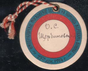 1914 г. 25.12.1914 г. Круг диаметром 58 мм. Трехцветная двусторонняя печать на толстом белом картоне. На лицевой стороне в тройной круглой рамке цветов Российского флага в центре белое поле. По периметру между рамками текст: «Императорские московские театры на помощь жертвам войны. 25 дек. 1914 г.…