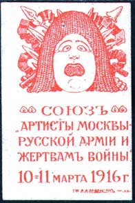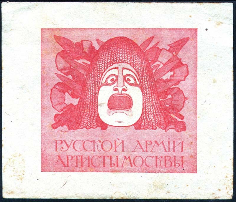1916 г. Листок разм. 118 х 111 мм. Одноцветная печать на тонкой желтоватой бумаге. Разм. рис. 88 х 82 мм. В центре маска на фоне различного холодного оружия, перевитого лентой. Ниже текст в две строки крупным шрифтом: «Русской армии артисты Москвы».