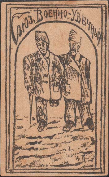 1917 г. 16.-17.12.1917 г. Разм. 41 х 68 мм. Одноцветная печать на желтоватой бумаге низкого качества. В рамке два инвалида войны. Сверху текст: «Союз Военно-Увечных».