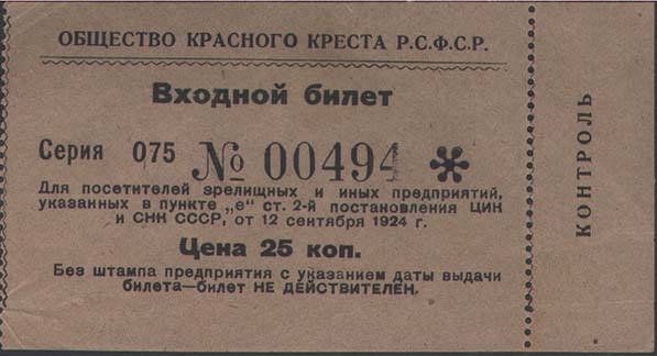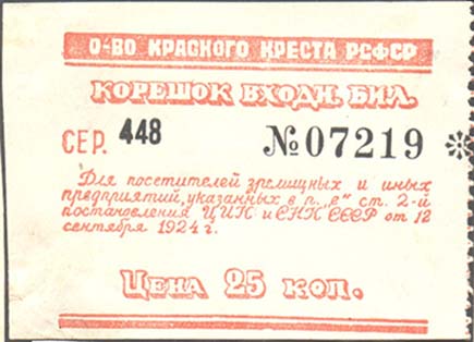 1924 г. Разм. 100 х 53 мм. Двухцветная печать на желтоватой бумаге. Слева односторонняя зубцовка. В рамке по углам номинал. Текст: «Общество Красного Креста РСФСР Входной билет Сер[ия]. ... №... Для посетителей зрелищных и иных мероприятий, указанных в пункте «е» ст. 2-й постановления ЦИК и СНК С…