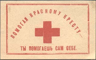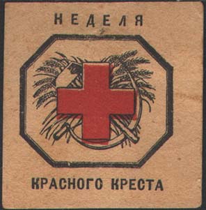 1928 г. Разм. рамки 36 х 54 мм. Одноцветная печать на белой бумаге. С клеем. В прямоугольной рамке в центре красный крест. Сверху текст в три строки: «Кр.С.С.Р. В пользу Красного Креста». Внизу номинал.