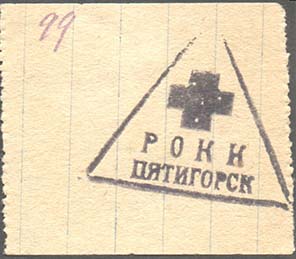 1928(?) г. Разм. 49 х 43 мм. Одноцветная печать на тетрадочной бумаге с линейными полосками. Вертикальная нерегулярная зубц. На лицевой стороне темно-фиолетовый оттиск треугольной печати с красным крестом и текстом в две строки: «РОКК Пятигорск». На оборотной стороне синий оттиск круглой печати с…