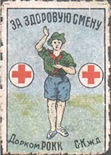 1928(?) г. Разм. рамки 23 х 35 мм. Многоцветная печать на белой бумаге. Нерегулярная зубц. В центре в прямоугольной рамке пионер. По бокам красные кресты в круглых рамках. Сверху полукругом текст: «За здоровую смену». Внизу полукругом текст: «Дорком РОКК С-К Ж.Д.».