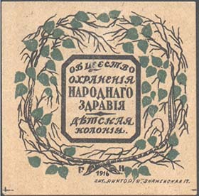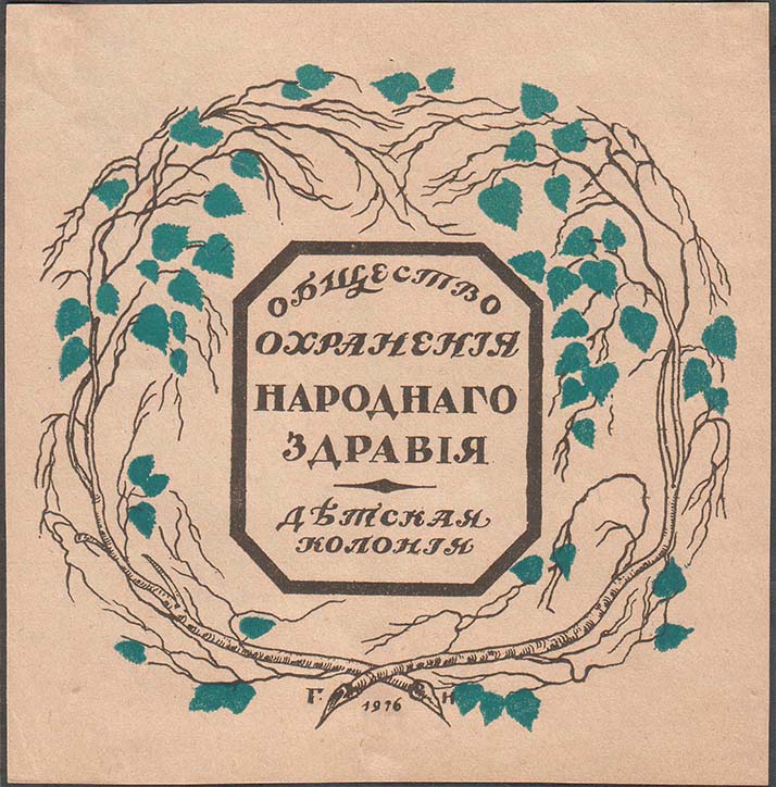 1916 г. 28.-30.09.1916 г. Разм. 47 х 47 мм. Двухцветная печать на бумаге различных оттенков и качества. В центре в обрамлении венка из березовых листьев восьмиугольная рамка разм. 19 х 20,5 мм. Сверху в рамке текст в четыре строки: «Общество охранения народного здравия». Внизу текст в две строки: …