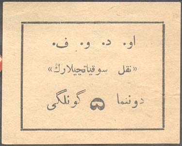 1928(?) г. Разм. 62 х 49 мм. Одноцветная печать на желтоватой бумаге. В прямоугольной рамке разм. 49,5 х 37 мм. Текст в три строки на узбекском языке арабским шрифтом.