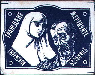 1915(?) г. Разм. рис. 51 х 37,5 мм. Одноцветная печать на белой бумаге. Сестра милосердия и больной. Текст: «Граждане, жертвуйте еврейской больнице».