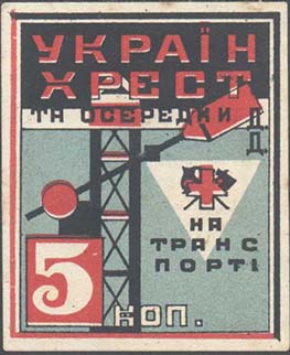 1931 г. Трехцветная двухсторонняя печать на белой бумаге. На лицевой стороне различные рисунки и текст на украинском языке: «Украинский красный крест и ячейки Д.Д. на транспорте». На оборотной стороне в центре в двойной рамке текст в три строки на украинском языке: «Принудительное распространение…