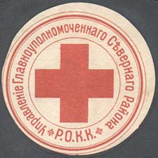 1915(?) г. Круг диаметром 42 мм. Одноцветная печать на белой бумаге. В двойной круглой рамке в центре красный крест. Между рамками по окружности текст: «Управление Главноуполномоченного Cеверного района Р.О.К.К.».