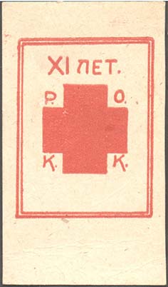 1929(?) г. Разм. 39 х 68 мм. Одноцветная печать на толстой кремовой бумаге. В центре в двойной прямоугольной рамке разм. 32,5 х 42,5 мм красный крест и аббревиатура «Р.О.К.К.». Сверху текст: «XI лет».
