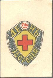 1961 г. Разм. 30 х 44 мм. Трехцветная печать на плотной белой бумаге. В центре в рамке в виде щитка сложной формы разм. 22 х 26 мм красный крест. По периметру между рамками растительный орнамент и текст: «1961 год. День здоровья».