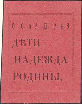 1919 г. 15.09.1919 г. Разм. 46 х 59 мм. Одноцветная печать на бумаге различных цветв. В центре в двойной прямоугольной рамке прямоугольной рамке разм. 37,5 х 45 мм сверху аббревиатура «О.С.и У.Д.Р.и З.». В центре текст в три строки: «Дети надежда Родины».