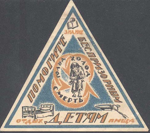1923 г. 22.12.1923 г. Треугольник разм. 82 х 72 мм. Двухцветная печать на белой бумаге. В центре в треугольной рамке разм. 72 х 67 мм аллегорический рисунок: в центре беспризорный ребенок, окруженный тремя стрелками с надписями «Голод», «Холод», «Смерть». По периметру рамки рисунки: книга и глобус…