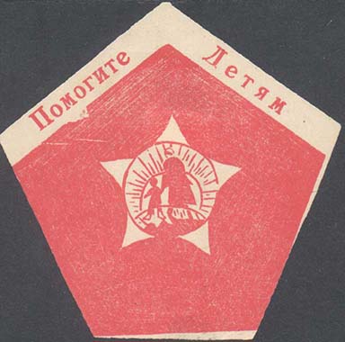 1924(?) г. Виньетка в форме пятиугольника разм. 60 х 65 мм. Одноцветная печать на белой бумаге. В центре пятиконечная звезда, в центре которой женщина с ребенком на фоне восходящего солнца. Сверху текст: «Помогите Детям».