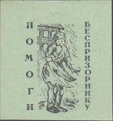 1924(?) г. Разм. 60 х 66 мм. Одноцветная печать на светло-зеленой бумаге. В центре беспризорник на фоне здания. Вертикально текст: «Помогите беспризорному».