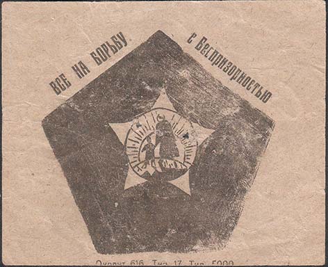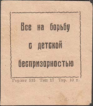 1931 г. 08.-10.10.1931 г. Разм. 49 х 56 мм. Одноцветная печать на желтоватой бумаге. В центре в прямоугольной волнистой рамке разм. 38 х 35 мм текст в три строки: «Все на борьбу с детской беспризорностью». Внизу под рамкой выходные данные мелким шрифтом: «Горлит 515 Тип 17 Тир. 10 т.».