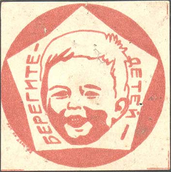 1929 г. 14.-17.04.l929 г. Разм. 59 х 59 мм. Одноцветная печать на желтоватой бумаге. В центре в круге диаметром 57 мм вписана пятиконечная звезда, в центре кото-рой голова ребенка. Текст: «Берегите - детей». Слева с наружной стороны круга неразборчиво выходные данные.