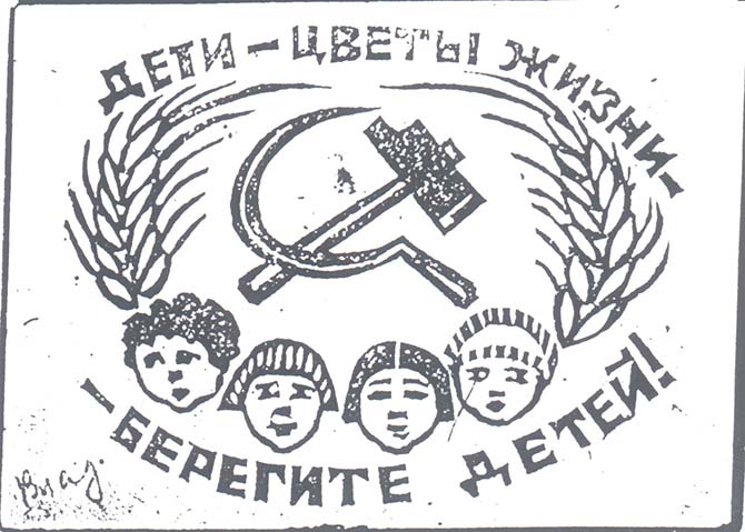 1931(?) г. Листок разм. 113 х 81 мм. Одноцветная печать на желтоватой бумаге. В центре серп и молот в обрамлении колосьев. Внизу четыре детских головы. Сверху полукругом текст: «Дети – цветы жизни». Внизу полукругом продолжение текста: «Берегите детей».