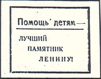 1930 г. Январь Разм. 60 х 46 мм. Одноцветная печать на тонкой серой бумаге. В центре в прямоугольной рамке разм. 48,5 х 39 мм текст в четыре строки: «Помощь детям – лучший памятник Ленину».