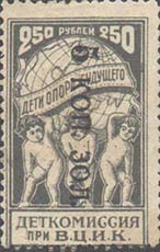 1924 г. Первый вспомогательный выпуск. Черная типографская надпечатки нового номинала на марках первого всесоюзного выпуска Деткомиссии при ВЦИК.