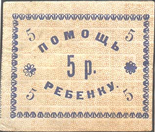 1923(?) г. Разм. 52 х 45 мм. Двухцветная печать на белой бумаге. В декоративной прямоугольной рамке разм. 48 х 36 мм в центре и по углам номинал. Текст в две строки: «Помощь ребенку».