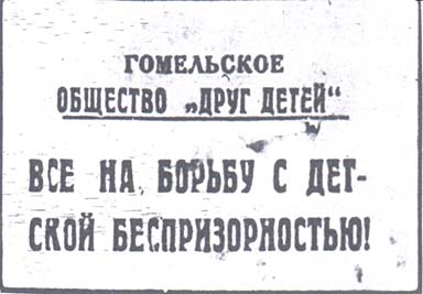 1924(?) г. Разм. 64 х 45 мм. Одноцветная печать на светло-сиреневой бумаге. Сверху текст в две строки: «Гомельское общество «Друг Детей»». Внизу текст в две строки: «Все на борьбу с детской беспризорностью!».