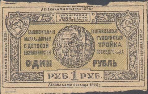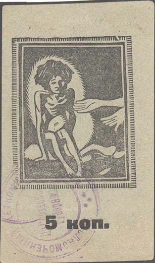 1923 г. Разм. 52 х 88 мм. Одноцветная печать на серо-зеленой бумаге. В центре в двойной декоратив-ной рамке 41 х 52 мм истощенный ребенок, к которому протягиваются руки. Внизу номинал: «5 коп.». На лицевой стороне фиолетовый оттиск круглой печати диаметром 35 мм. На печати текст: «Уполномоченный …