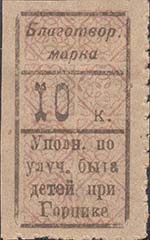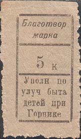1924(?) г. Разм. 27 х 48 мм. Одноцветная печать на желтоватой бумаге. Нерегулярная зубцовка. В прямоугольной рамке разм. 19 х 36 мм в центре номинал. Сверху текст в две строки: «Благотвор[ительная]» марка. Внизу текст в четыре строки: «Уполн[омоченный] по улуч[шению] быта детей при Горцике».