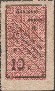 1923 г. Разм. рамки 73 х 44 мм. Двухцветная печать на желтоватой бумаге. В центре в двойной декоративной прямоугольной рамке в дополнительной круглой рамке женщина с двумя детьми на фоне городских построек. Слева и справа номинал. Слева на фоне цифр номинала текст в четыре строки: «Благотворител…