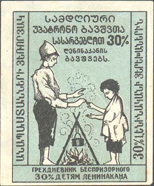 1924(?) г. Разм. 51 Х 62 ММ. Двухцветная печать на белой бумаге. В двойной прямоугольной рамке разм. 44 х 57 мм двое беспризорных детей у костра, на котором подвешен котелок. Внизу текст в две строки: «Трехдневник беспризорного. 30% детям Ленинакана». Сверху текст в пять строк на армянском языке.…