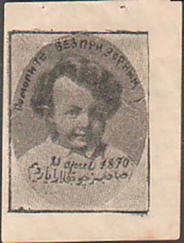 1925(?) г. Разм. 43 х 57 мм. Одноцветная печать на белой бумаге. В центре в прямоугольной рамке разм. 34 х 42,5 мм портрет Володи Ульянова трех лет. Сверху полукругом текст: «Помоготе беспризорным». Внизу текст: «21 апреля 1870». Ниже текст на армянском(?) языке.