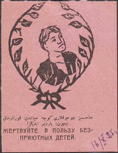 1925 г. 16.10.1925 г. Одноцветная печать на бумаге различных цветов. В центре различные рисунки. Внизу текст в две строки на русском и азербайджанском языке арабской графикой: «Жертвуйте в пользу бесприютных детей».