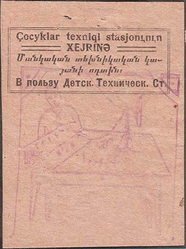 1932 г. Одноцветная печать на серо-зеленоватой бумаге. В центре серп и молот. Сверху текст на азербайджанском языке латинским шрифтом. Внизу текст: «В пользу детей».