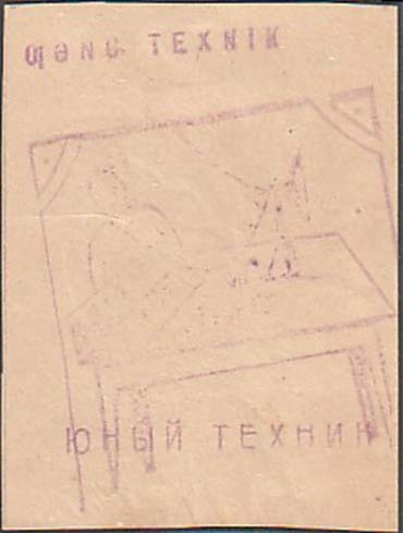 1932 г. 10.03.1932 г. Разм. 81 х 61 мм. Одноцветная печать на желто-серой бумаге. На лицевой стороне ручной оттиск фиолетового штампа на котором в прямоугольной декоративной рамке пионер у стола с радиоприборами. Сверху текст на азербайджанском языке латинским шрифтом. Внизу текст: «Юный техник».