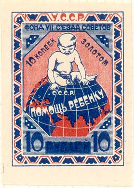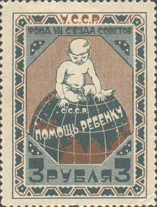 1923 г. Разм. рамки 32 х 44 мм. Двухцветная печать на белой (оттенки) бумаге. В центре в восьмиугольной рамке ребенок, сидящий на земном шаре. На земном шаре текст: «Помощь ребенку». Сверху текст: «У.С.С.Р.». Ниже под рамкой текст: «Фонд VII съезда советов». Внизу номинал.