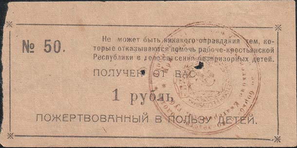 1924 г. Листок из квитанционной книжки разм. ≈ 102 х 50 мм. Одноцветная печать на тонкой светло-серой бумаге. В прямоугольной рамке разм. 93 х 38 мм с декоративными элементами по углам в центре текст в три строки: «Получено от вас ... рубль пожертвованный в пользу детей». В правом верхнем углу те…