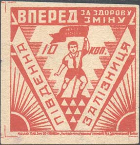 1927 г. Разм. 53 х 57 мм мм. Одноцветная печать на плотной бежевой бумаге. Пионер с флагом, железнодорожные пути, стрелка и светофор. На флаге текст в три строки на украинском языке: «На помощь оздоровлению детей». В левом нижнем углу аббревиатура: «МСУ КЗ». Внизу мелким шрифтом выходные данные н…