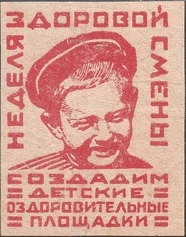 1926(?) г. Разм. 46 х 61 мм. Одноцветная печать на желто-ватой бумаге. В центре изображение головы ребенка в кепке. Сверху и по бокам по периметру текст: «Неделя здоровой смены». Внизу текст в четыре строки: «Создадим детские оздоровительные площадки» и декоративные элементы в виде четырех пар ко…