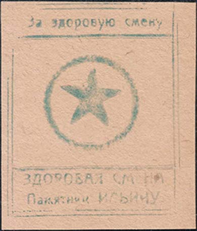 1930 г. Разм. 65 х 75 мм. Одноцветная печать на желтоватой бумаге. В центре оттиск ручного штампа. В двойной прямоугольной рамке разм. 57 х 70 мм в центре в круглой рамке пяти-конечная звезда. Сверху текст: «За здоровую смену». Внизу текст в две строки: «Здоровая смена Памятник Ильичу».