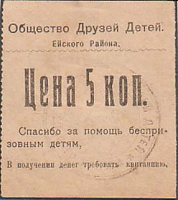 1926(?) г. Листок из квитанционной книжки разм. 54 х 60 мм. Одноцветная печать на желтоватой бумаге. Левосторонняя нерегулярная зубц. В центре номинал: «Цена 5 коп.». Сверху текст в две строки: «Общество Друзей Детей Ейского Района» и горизонтальная волнистая черта. Внизу текст в три строки: «Спа…